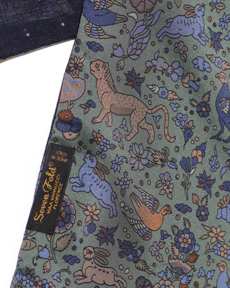 表面はシルク100%のアニマルとボタニカルプリント、裏面はウール70%、シルク30%のドットプリントのガーゼ素材になっているスカーフです。