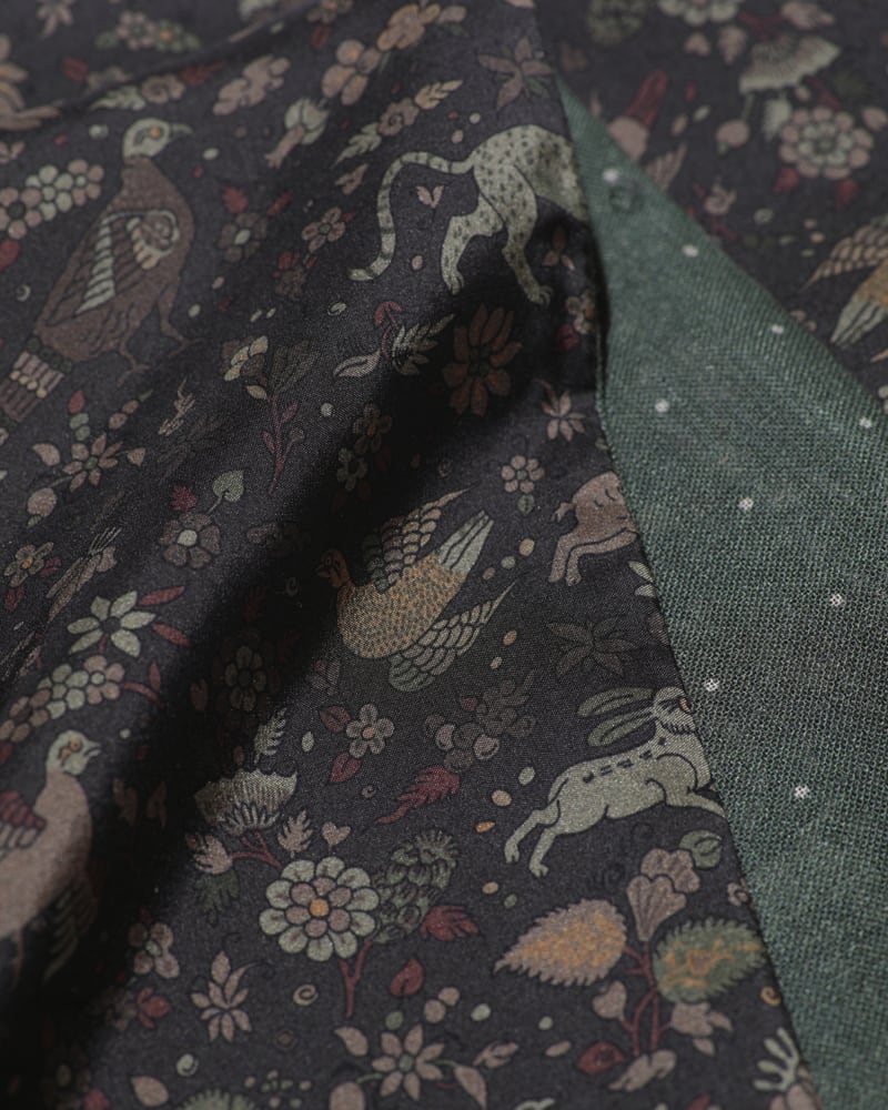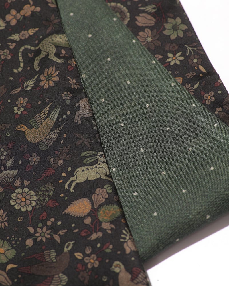 表面はシルク100%のアニマルとボタニカルプリント、裏面はウール70%、シルク30%のドットプリントのガーゼ素材になっているスカーフです。