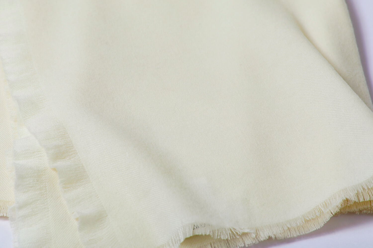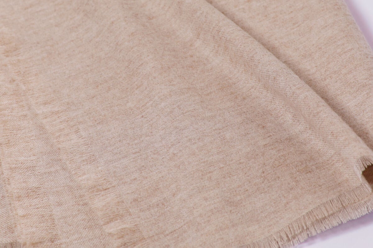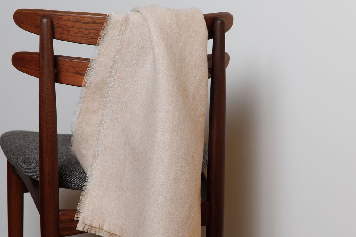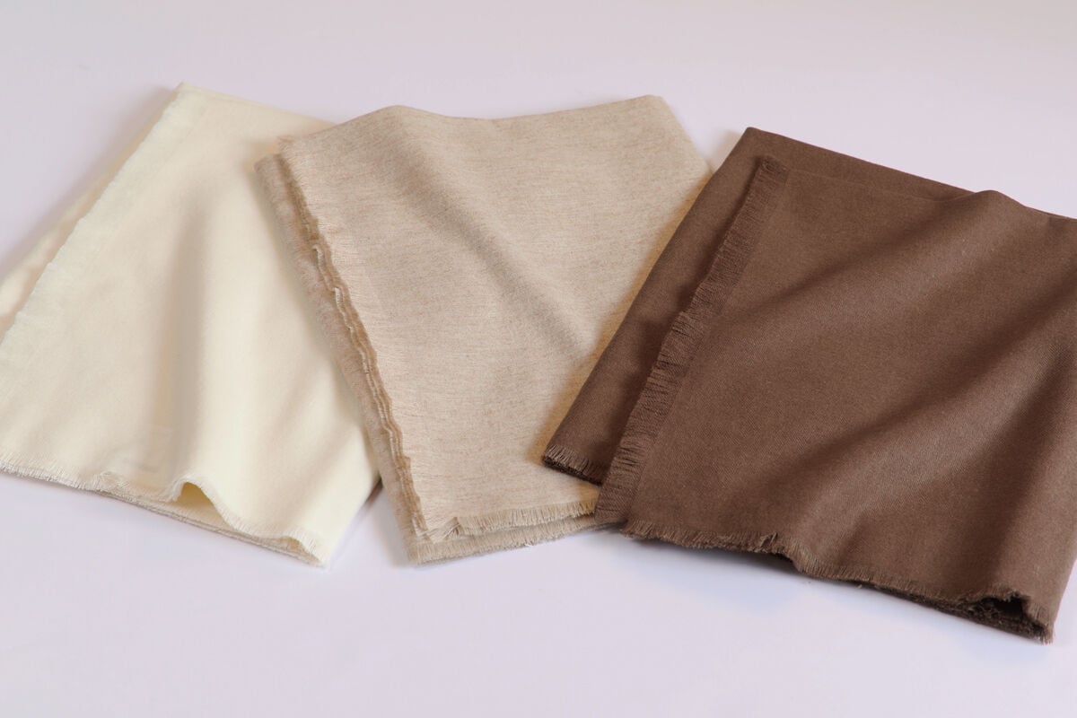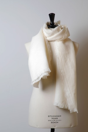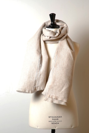 こちらはウール55%、リネン40%、カシミア5%の組成で、リネン40%混ならではの独特の張りをもちながら、上質なウールとカシミアをブレンドすることで非常にソフトな風合いと暖かさも備えた、なんとも不思議なタッチが魅力のストールです。
